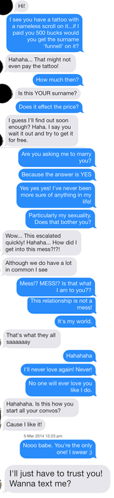 I told him I was up and that I was choosing between which boob to get my Harry Styles tattoo on…He didn’t mind this. He told me he didn’t mind what kind of music I liked because I “seem like a pretty cool chick”. Okay, Davy. I don’t know about you, but last time I checked, trying to coerce strangers off Tinder into bidding on 1D merchandise is pretty much the antitheses of cool. This one actually started to freak ME out.